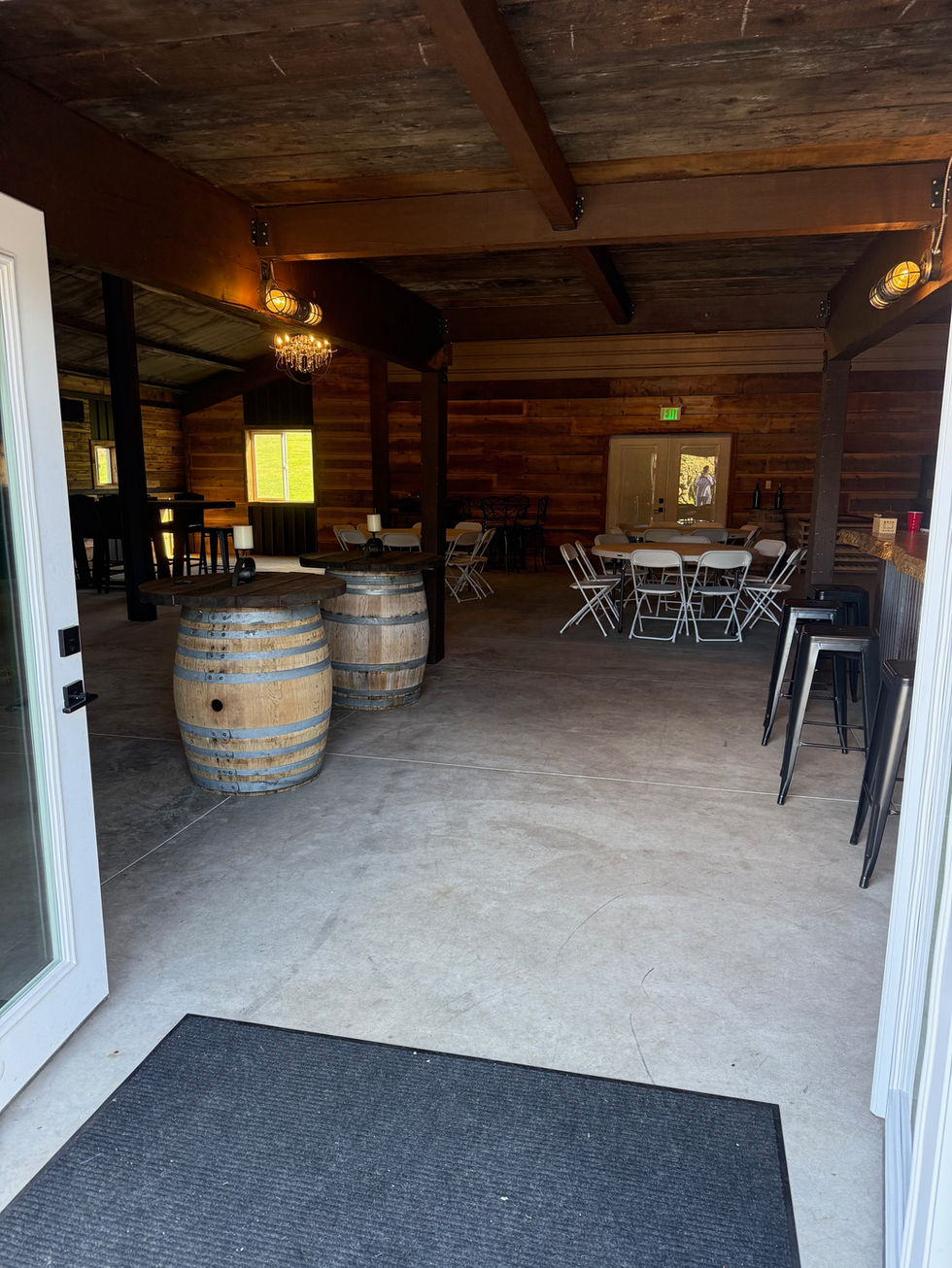 This showcases the rustic decor and ambiance of the ranch, featuring wooden barrels, chandeliers, floral arrangements. The images capture the warm and inviting atmosphere of, perfect for hosting various events and gatherings.